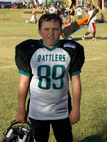 Jake is playing football again this year. He has worked very hard and this past week he worked his way into the starting line-up and played the entire game! This is a huge improvement from the begining of the season when he didn't even get into the regular game. What a great life lesson Jake has learned. He can achieve anything if he doesn't give up, with hard work, determination and a positive attitude.